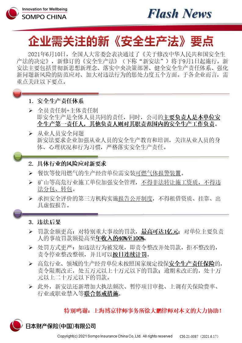 2021年6月21日起,本公司开展“安全生产周”活动。活动期间,为了提升大家安全意识,特将本公司制作的防灾防损,安全生产快讯《高层火灾逃生要点》以及《企业需关注的新<安全生产法>要点》分享给大家,希望可以给大家的工作和生活带来帮助。