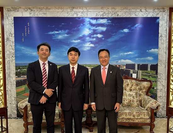 1. 中:外交学院党委书记崔启明。左:本公司拟任副董事长、总经理松尾俊哉。右:本公司董事副总经理田嘉铭
