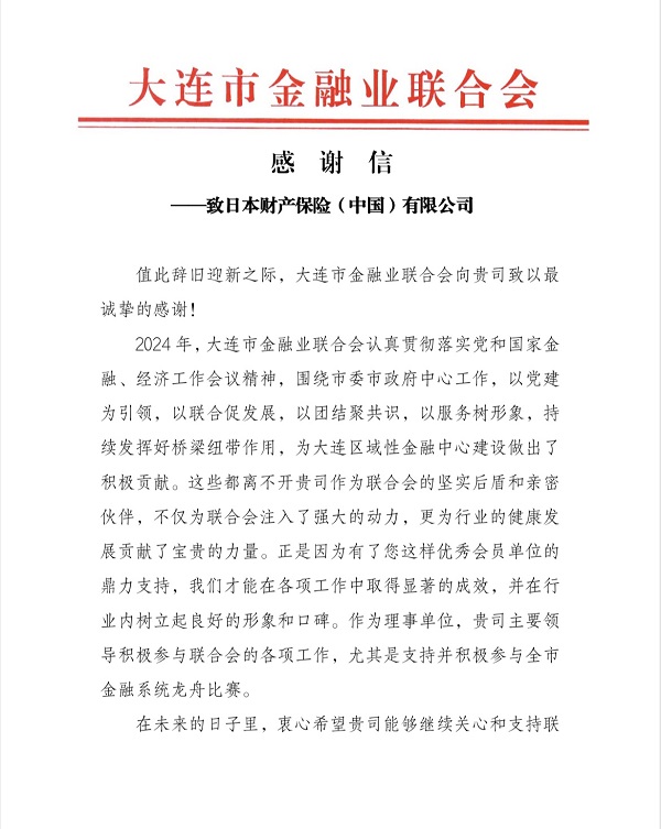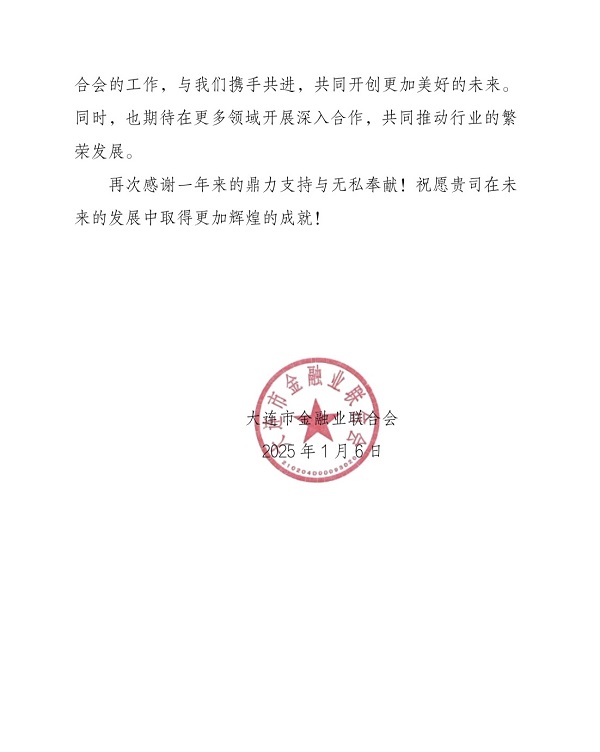 1月6日,大连市金融业联合会向本公司发来感谢信。