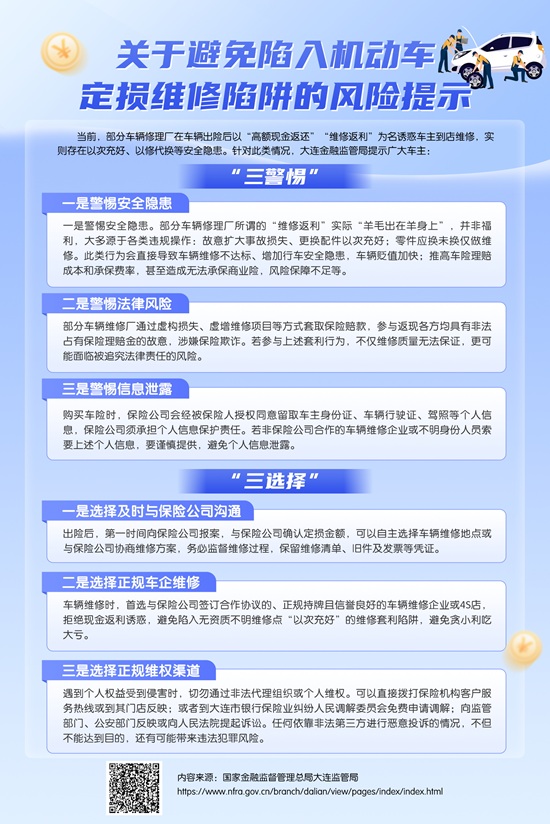 当前,部分车辆修理厂在车辆出险后以“高额现金返还”“维修返利”为名诱惑车主到店维修,实则存在以次充好、以修代换等安全隐患。针对此类情况,大连金融监管局提示广大车主: