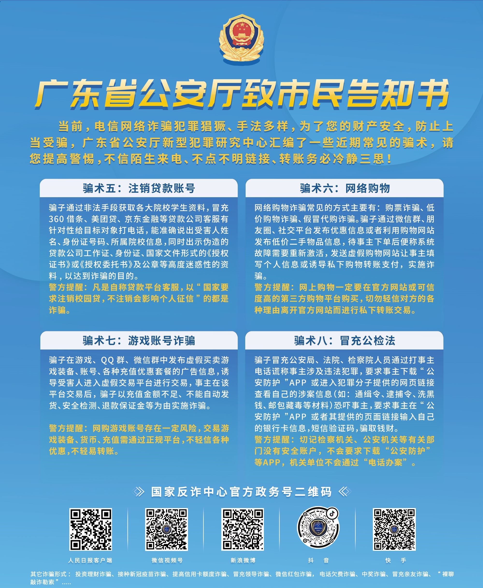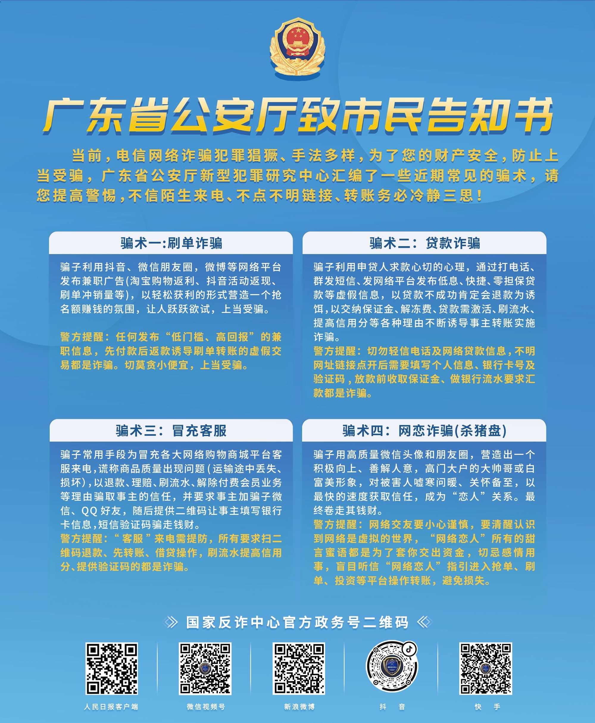 电信网络诈骗犯罪猖獗、手法多样,为了您的财产安全,防止上当受骗,请对以下骗术提高警惕!