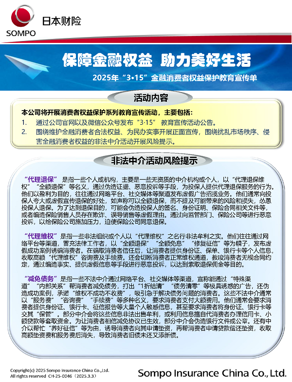 为全面贯彻落实党的二十大和二十届二中、三中全会精神以及中央金融工作会议精神,深刻把握金融工作政治性、人民性,积极践行以人民为中心的价值取向,帮助社会公众增强维护自身合法权益的意识和能力,本公司以“3.15”国际消费者权益日为契机,在此期间开展金融消费者权益保护教育宣传活动。